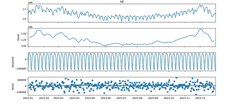 Once we have arrived at this point, we will decompose our series into three different parts: Trend, Seasonal, and Resid. We will utilize libraries such as statmodels for this purpose.